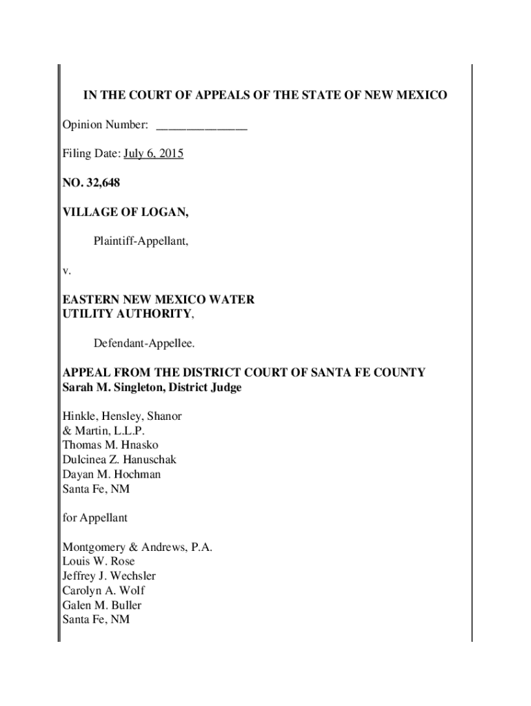 IN THE COURT OF APPEALS OF THE STATE OF NEW MEXICO Opinion Number: ___ Filing Date: July 6, 2015 NO. 32,648 VILLAGE OF LOGAN, PlaintiffAppellant, v. EASTERN NEW MEXICO WATER UTILITY AUTHORITY, DefendantAppellee.