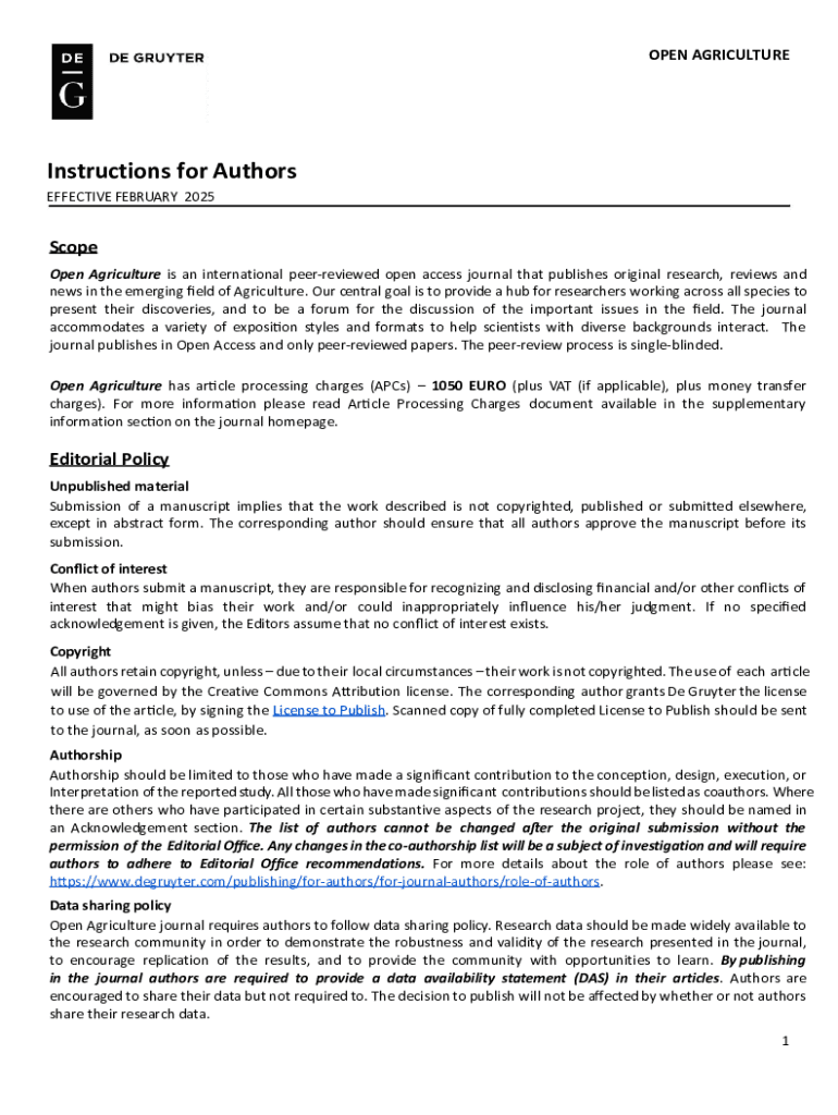 OPEN AGRICULTUREInstructions for Authors EFFECTIVE FEBRUARY 2025Scope Open Agriculture is an international peerreviewed open access journal that publishes original research, reviews and news in the