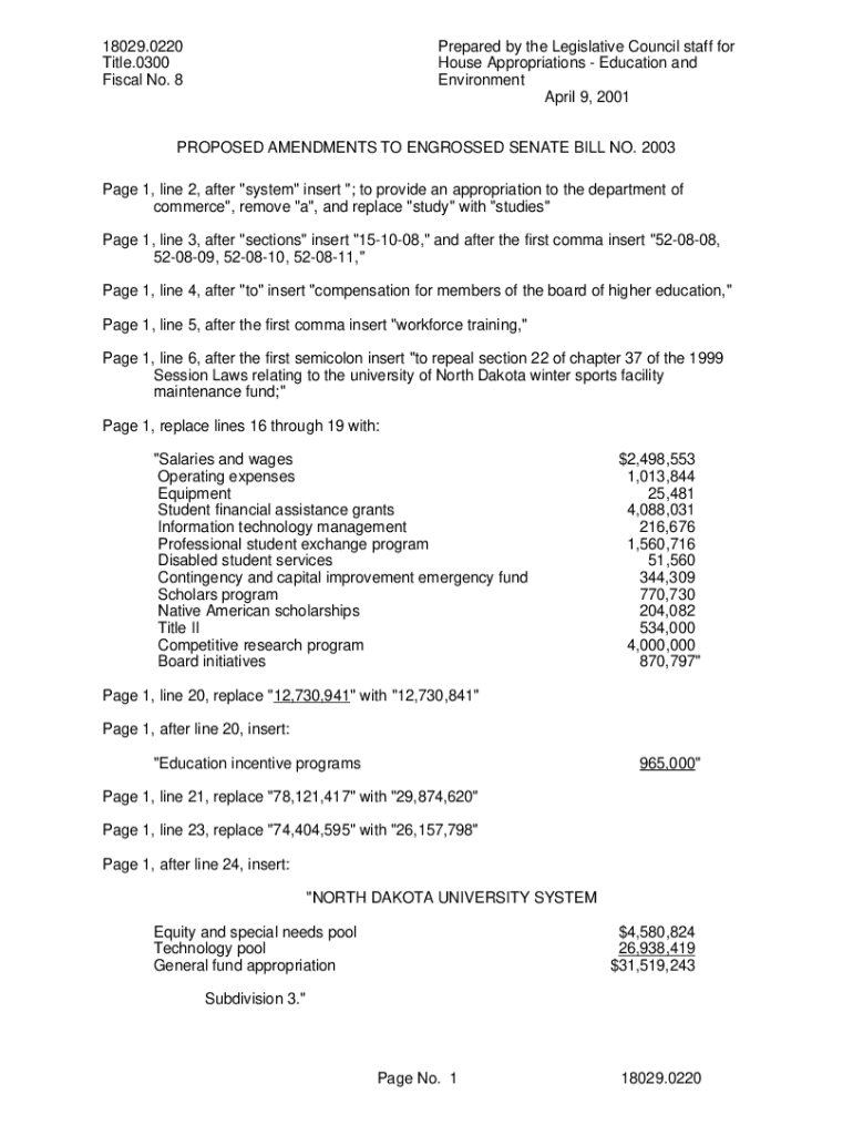 18029.0220 Title.0300 Fiscal No. 8Prepared by the Legislative Council staff for House AppropriationsEducation and Environment April 9, 2001PROPOSED AMENDMENTS TO ENGROSSED SENATE BILL NO. 2003 Page