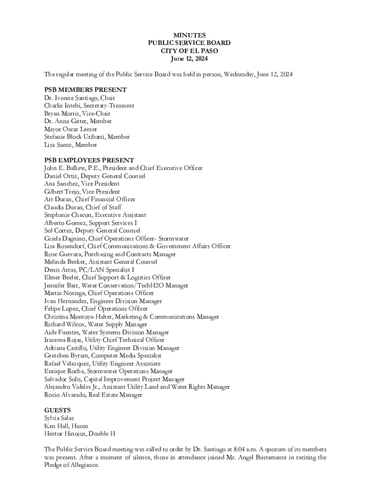 MINUTES PUBLIC SERVICE BOARD CITY OF EL PASO June 12, 2024 The regular meeting of the Public Service Board was held in person, Wednesday, June 12, 2024 PSB MEMBERS PRESENT Dr. Ivonne Santiago, Chair