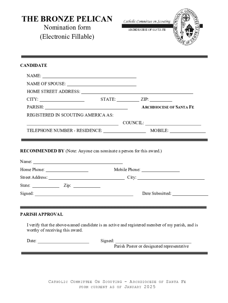 THE BRONZE PELICAN Nomination form (Electronic Fillable)CANDIDATE NAME: ___ NAME OF SPOUSE: ___ HOME STREET ADDRESS: ___ CITY: ___STATE: ___ ZIP: ___PARISH: ___ARCHDIOCESE OF SANTA FEREGISTERED IN