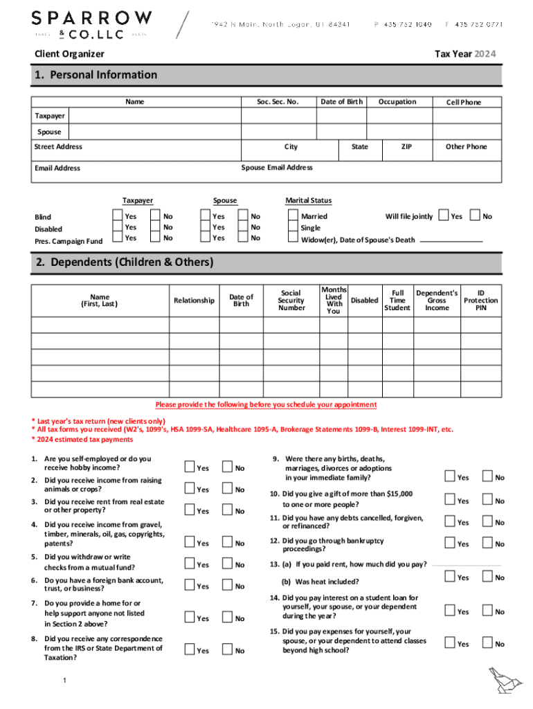 Client OrganizerTax Year 20241. Personal Information NameSoc. Sec. No.Date of BirthOccupationCell PhoneTaxpayer Spouse Street AddressCityStateZIPOther PhoneSpouse Email AddressEmail AddressTaxpayer