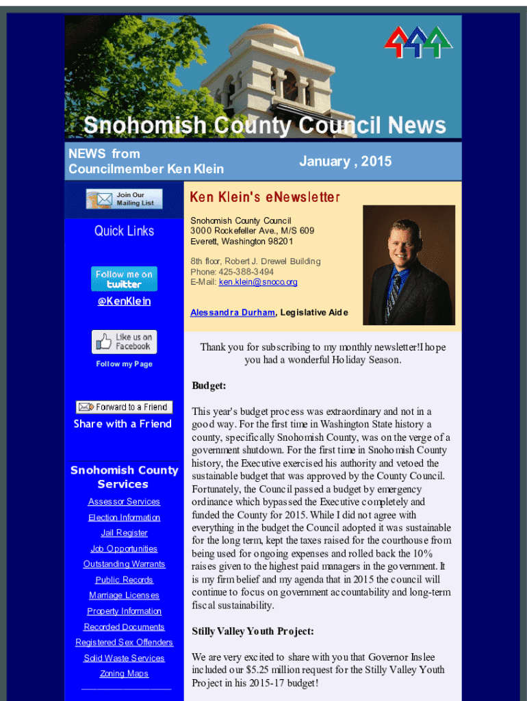 NEWS from Councilmember Ken KleinJanuary , 2015Ke n Kl e i n\' s e Ne ws l e tte r Quick LinksSnohomish County Council 3000 Rockefeller Ave., M/S 609 Everett, Washington 98201 8th floor, Robert J.