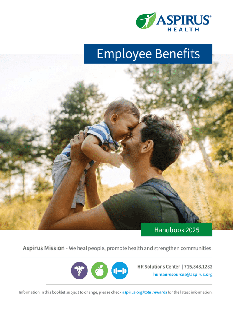 Employee BenefitsHandbook 2025 Aspirus MissionWe heal people, promote health and strengthen communities. HEAL PEOPLEPROMOTE HEALTHSTRENGTHEN COMMUNITIESHR Solutions Center | 715.843.1282 humanresources@aspirus.org