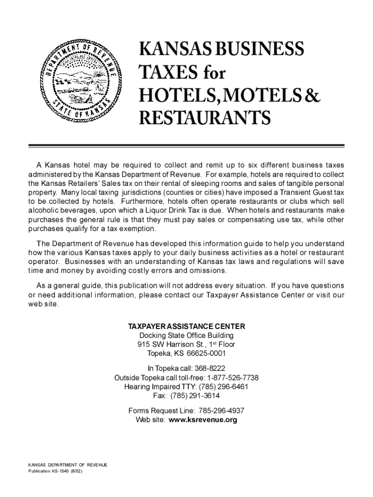 Get the free KANSAS BUSINESS TAXES for HOTELS, MOTELS & RESTAURANTS