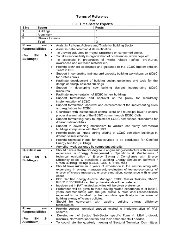Terms of Reference For Full Time Sector Experts S.No 1 2 3Sector Posts Buildings 1 Aluminium 1 Climate Finance 1 Total 3 Roles andAssist in Perform, Achieve and Trade for Building Sector ResponsibilitiesAssist