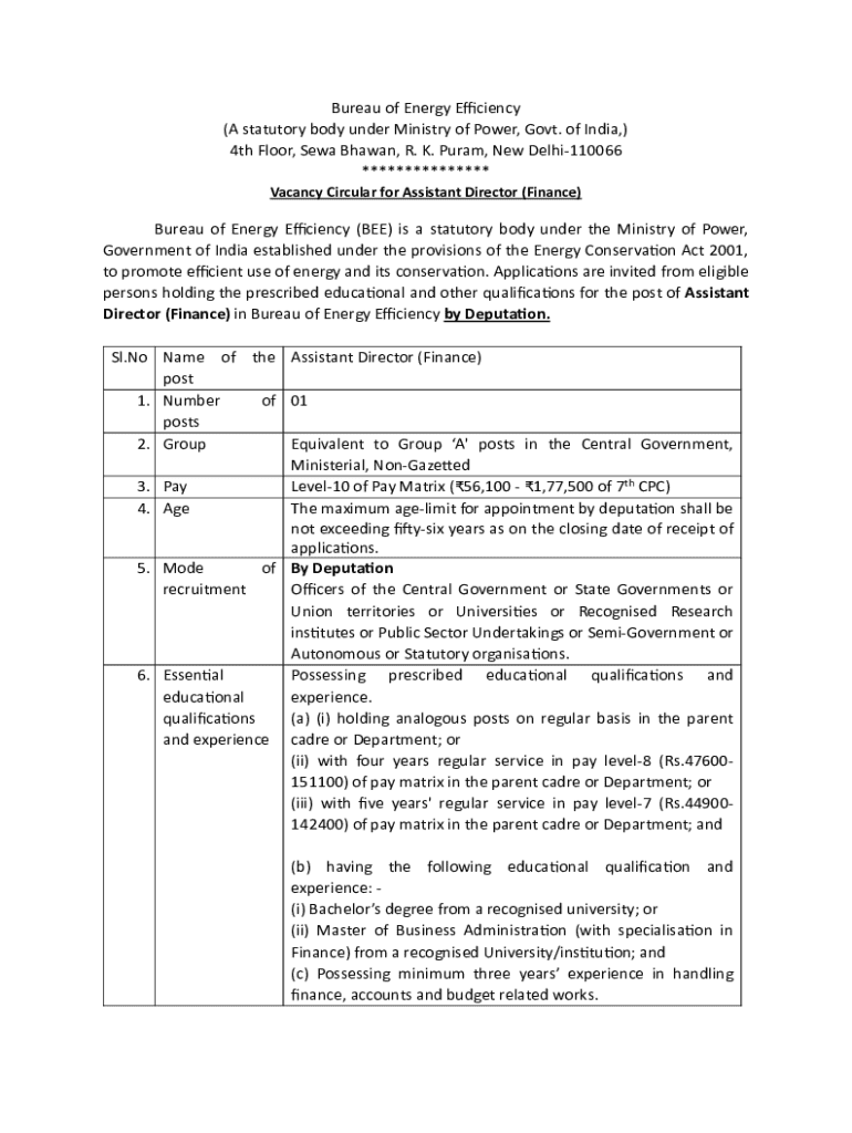 Bureau of Energy Efficiency (A statutory body under Ministry of Power, Govt. of India,) 4th Floor, Sewa Bhawan, R. K. Puram, New Delhi110066 *************** Vacancy Circular for Assistant Director