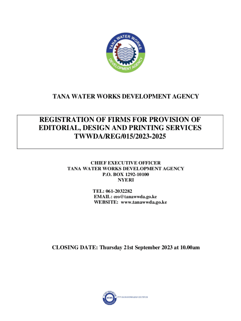 TANA WATER WORKS DEVELOPMENT AGENCYREGISTRATION OF FIRMS FOR PROVISION OF EDITORIAL, DESIGN AND PRINTING SERVICES TWWDA/REG/015/20232025CHIEF EXECUTIVE OFFICER TANA WATER WORKS DEVELOPMENT AGENCY