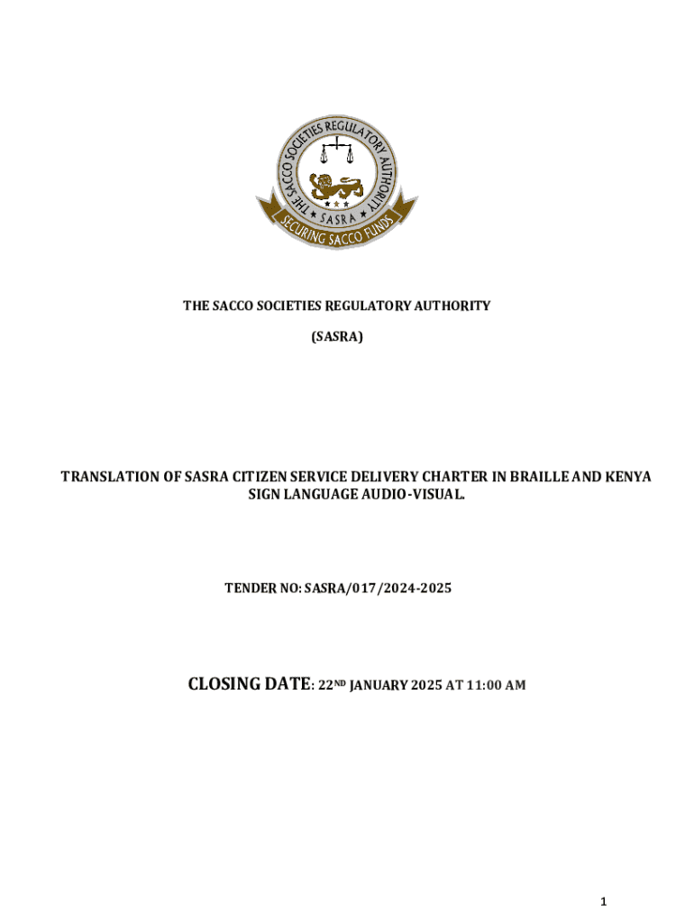 THE SACCO SOCIETIES REGULATORY AUTHORITY (SASRA)TRANSLATION OF SASRA CITIZEN SERVICE DELIVERY CHARTER IN BRAILLE AND KENYA SIGN LANGUAGE AUDIOVISUAL.TENDER NO: SASRA/017/20242025CLOSING DATE: 22ND