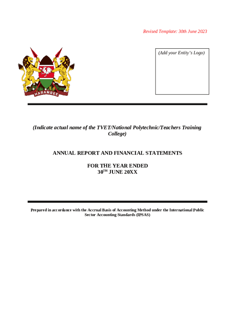 An annual financial reporting template for Technical and Vocational Education and Training institutions (TVETs) serves as a crucial tool for documenting and presenting an institution's financial status over the year. This template enables TVET administrators to organize financial information systematically, so stakeholders such as government bodies, funding agencies, and the community can assess the institution's financial health.