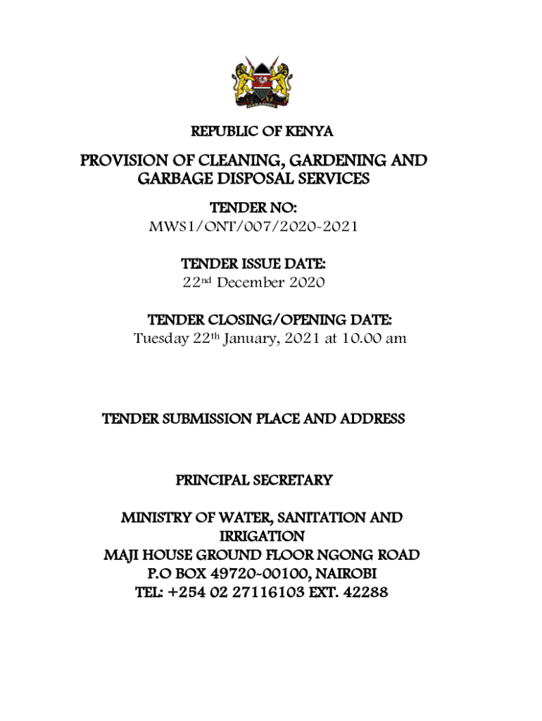 REPUBLIC OF KENYAPROVISION OF CLEANING, GARDENING AND GARBAGE DISPOSAL SERVICES TENDER NO: MWS1/ONT/007/20202021 TENDER ISSUE DATE: 22nd December 2020 TENDER CLOSING/OPENING DATE: Tuesday 22th January,