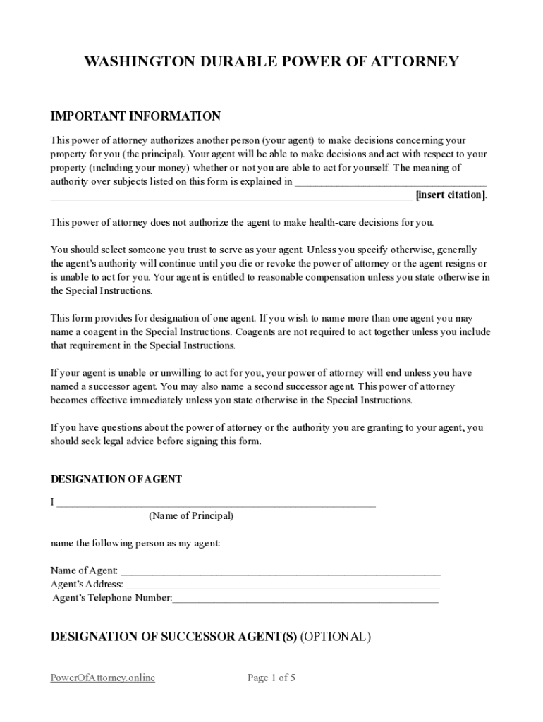 Washington recognizes various types of Durable Power of Attorney, tailoring the powers given to the agent according to the needs of the principal. A General POA allows broad powers over personal and financial matters, while a Limited POA restricts the agent’s authority to specific transactions. A Medical POA specifically concentrates on health care decisions, ensuring that the agent can make choices regarding the principal's medical treatment.