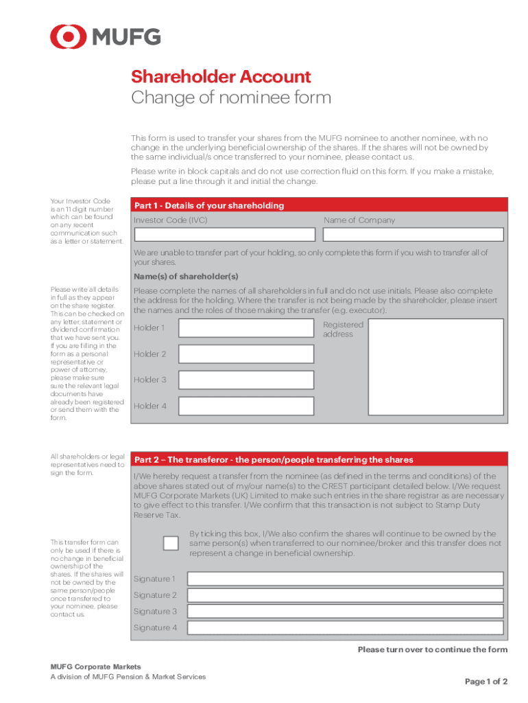 Get the free Shareholder Account Nominee or broker transfer request form