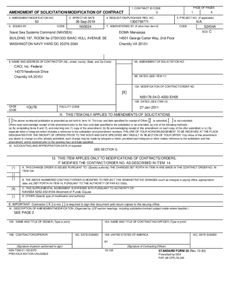 Get the free The purposes of this Modification is to N00178-04-D-4030-EH05-50 is to: