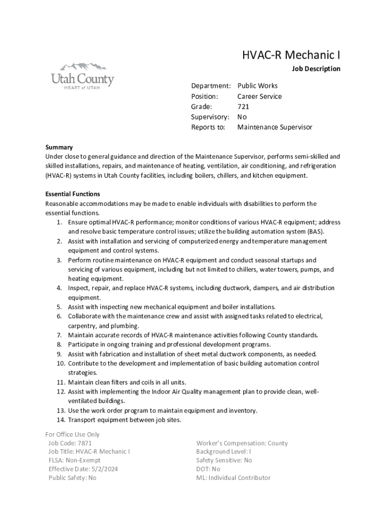 HVACR Mechanic I Job DescriptionDepartment: Position: Grade: Supervisory: Reports to:Public Works Career Service 721 No Maintenance SupervisorSummary Under close to general guidance and direction