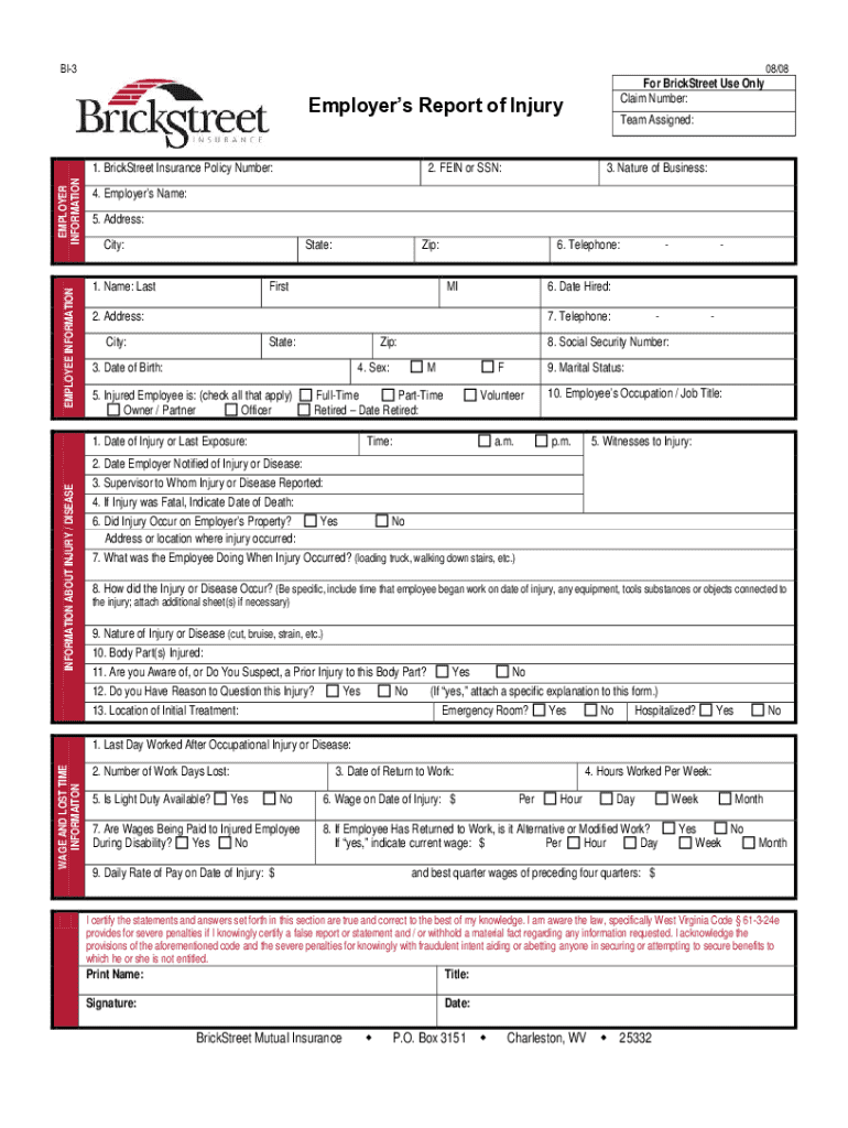 BI308/08For BrickStreet Use Only Claim Number:Employers Report of InjuryEMPLOYEE INFORMATIONEMPLOYER INFORMATION1. BrickStreet Insurance Policy Number:2. FEIN or SSN:Team Assigned:3. Nature of Business:4.