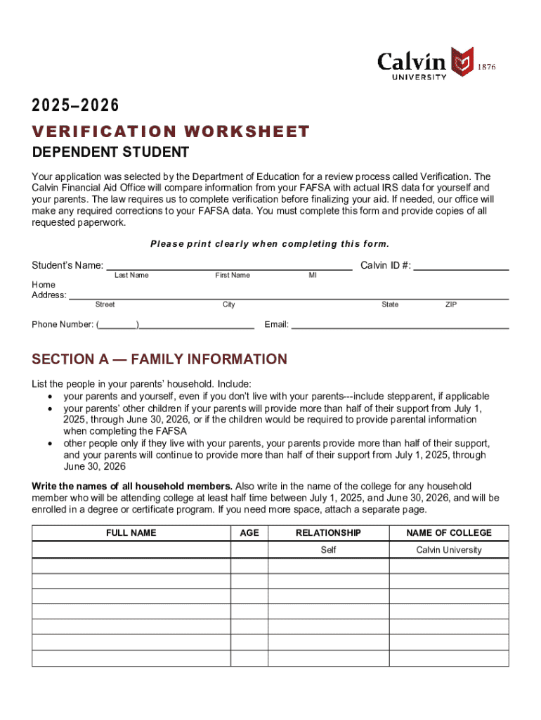 2 0 2 5 2 02 6 VERIFICATION WORKSHEET DEPENDENT STUDENTYour application was selected by the Department of Education for a review process called Verification. The Calvin Financial Aid Office will compare