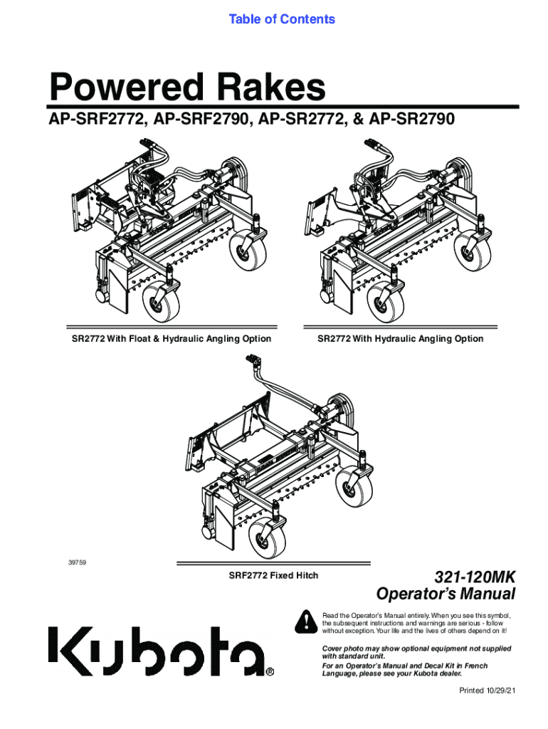Table of ContentsPowered RakesAPSRF2772, APSRF2790, APSR2772, & APSR2790SR2772 With Hydraulic Angling OptionSR2772 With Float & Hydraulic Angling Option39759SRF2772 Fixed Hitch!321120MK Operators