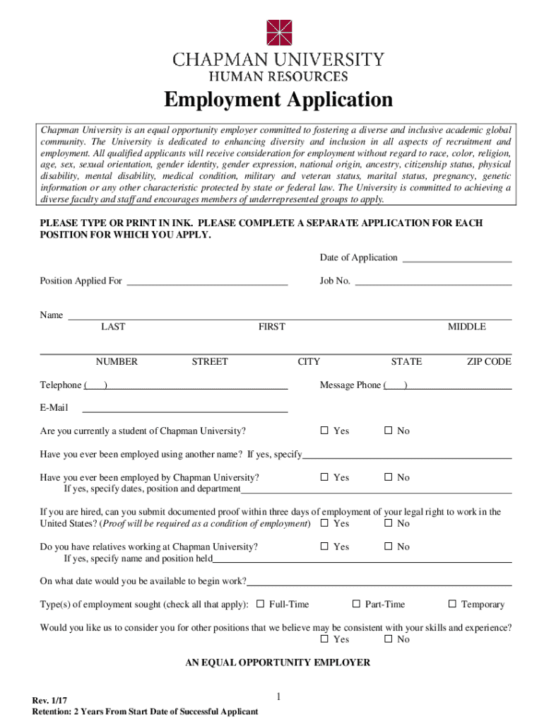 Employment Application Chapman University is an equal opportunity employer committed to fostering a diverse and inclusive academic global community. The University is dedicated to enhancing diversity