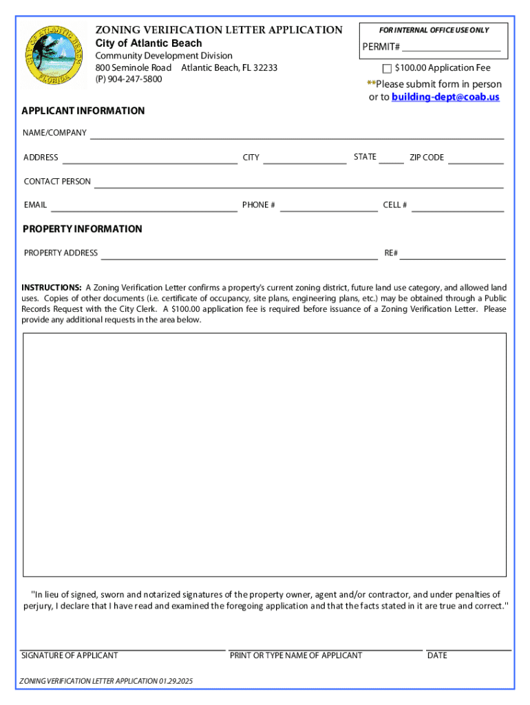 ZONING VERIFICATION LETTER APPLICATION City of Atlantic BeachFOR INTERNAL OFFICE USE ONLYPERMIT# ___Community Development Division 800 Seminole Road Atlantic Beach, FL 32233 (P) 9042475800$100.00