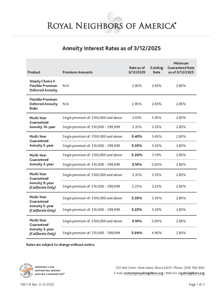 Get the free Royal Neighbors Annuity Interest Rates as of 3/12/2025, Form 1001-IR