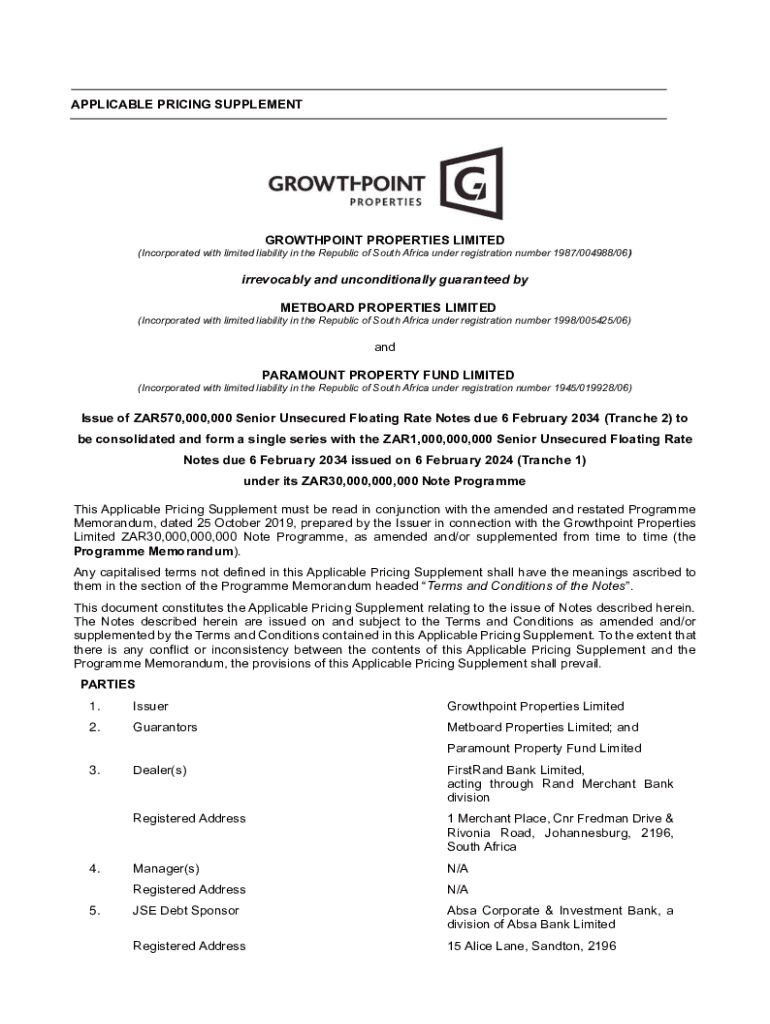 APPLICABLE PRICING SUPPLEMENTGROWTHPOINT PROPERTIES LIMITED (Incorporated with limited liability in the Republic of South Africa under registration number 1987/004988/06)irrevocably and unconditionally