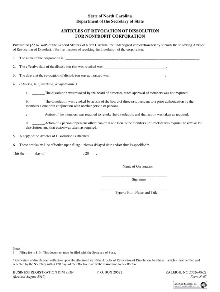 Get the free Articles of Revocation of Dissolution for Nonprofit Corporation