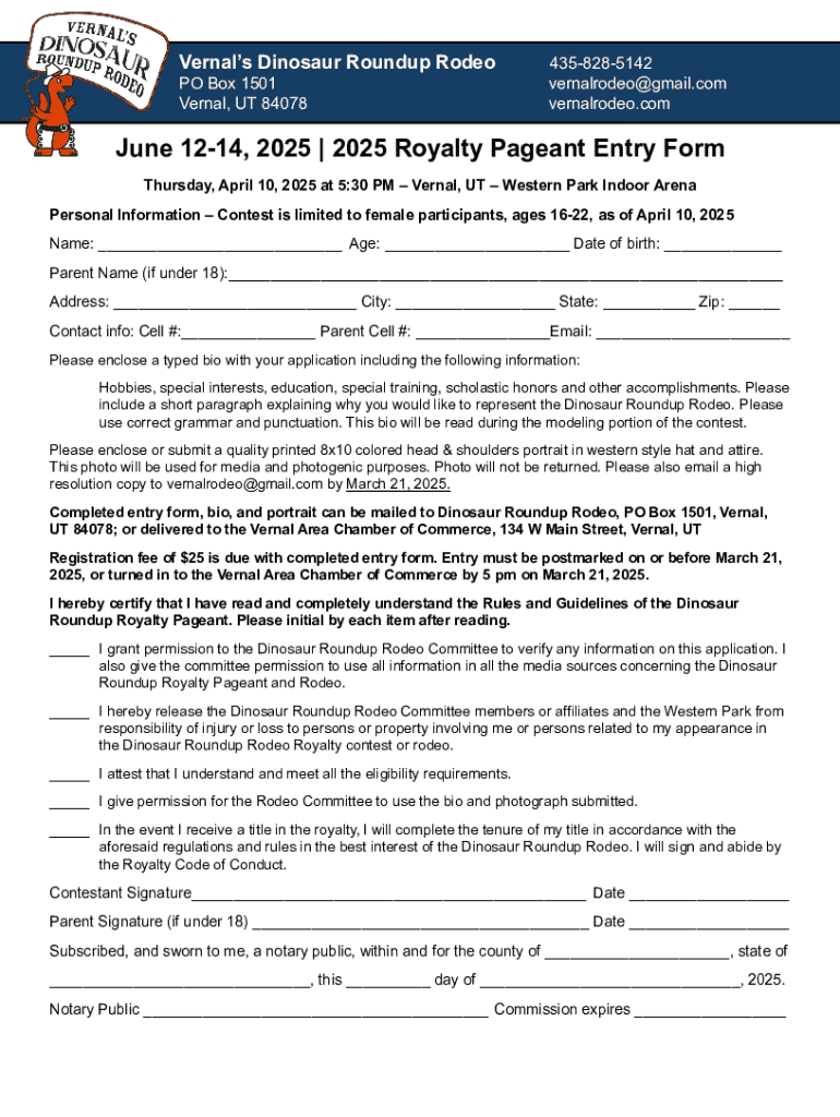Get the free June 12-14, 20252025 Royalty Pageant Entry Form