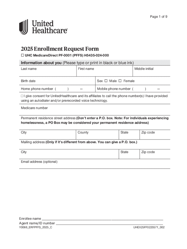 Page 1 of 92025 Enrollment Request FormUHC MedicareDirect PF0001 (PFFS) H5435024000Information about you (Please type or print in black or blue ink) Last nameFirst nameSexMaleFemaleBirth date Home