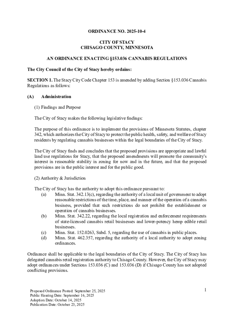 ORDINANCE NO. 2025104 CITY OF STACY CHISAGO COUNTY, MINNESOTA AN ORDINANCE ENACTING 153.036 CANNABIS REGULATIONS The City Council of the City of Stacy hereby ordains: SECTION 1. The Stacy City Code