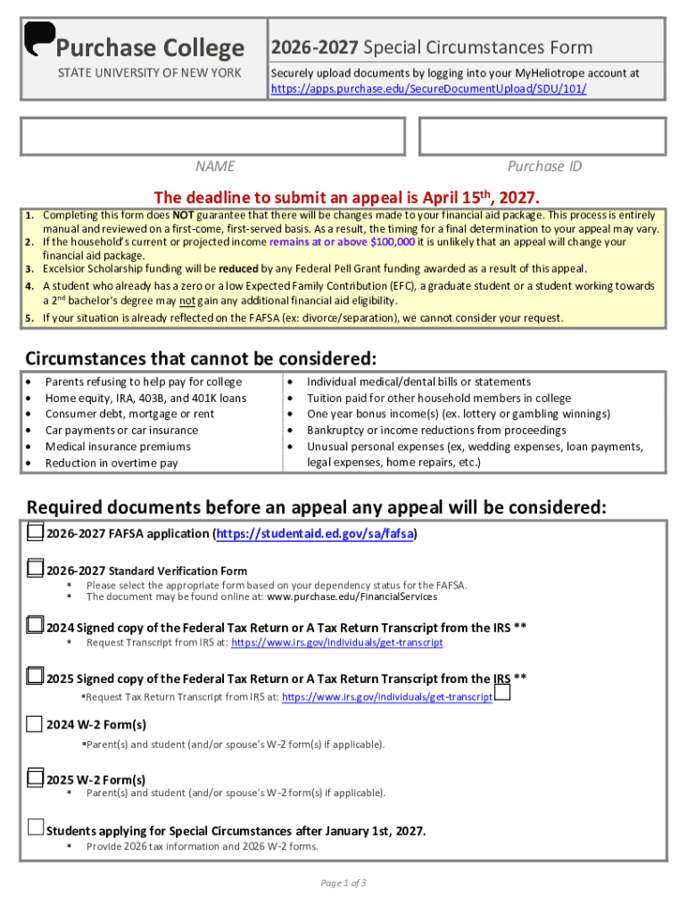 Get the free 2025-2026 Special Circumstances Form Purchase College