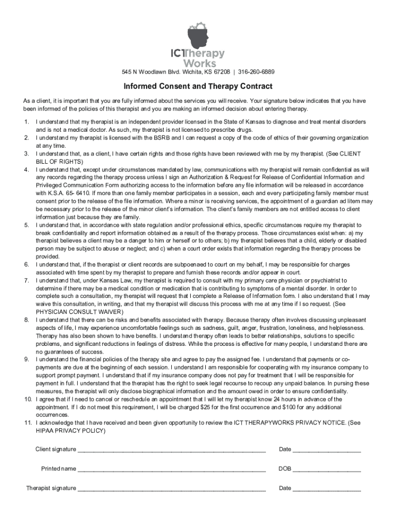 545 N Woodlawn Blvd. Wichita, KS 67208 | 3162606889Informed Consent and Therapy Contract As a client, it is important that you are fully informed about the services you will receive. Your signature
