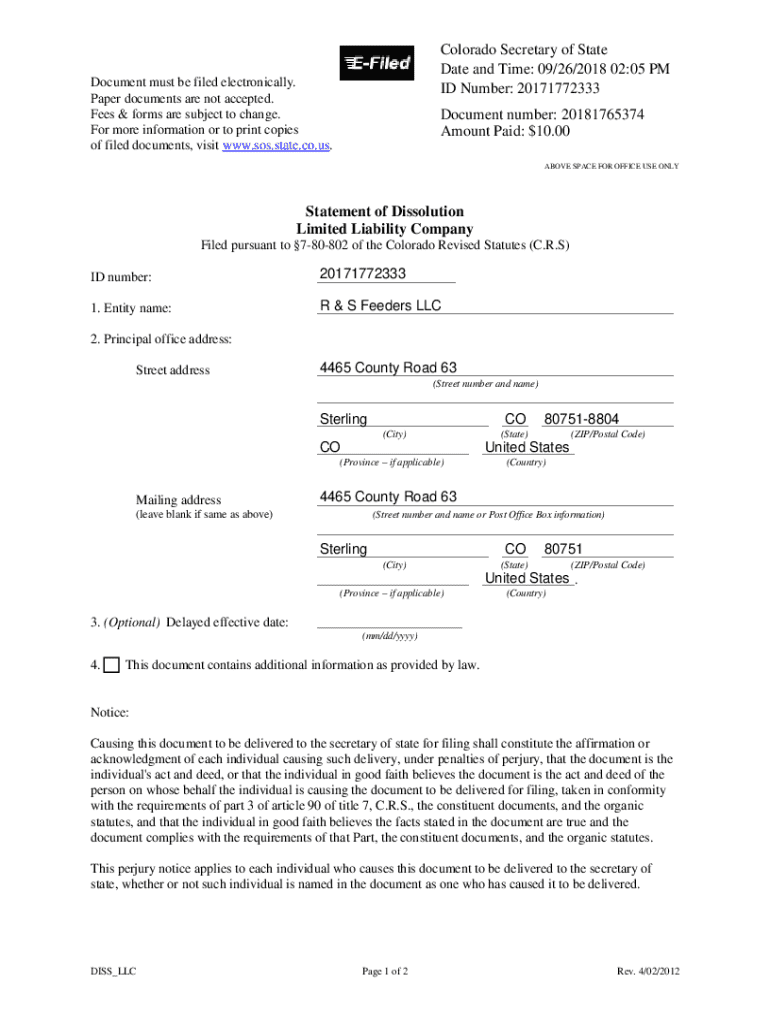 Colorado Secretary of State Date and Time: 09/26/2018 02:05 PM ID Number: 20171772333Document must be filed electronically. Paper documents are not accepted. Fees & forms are subject to change. For