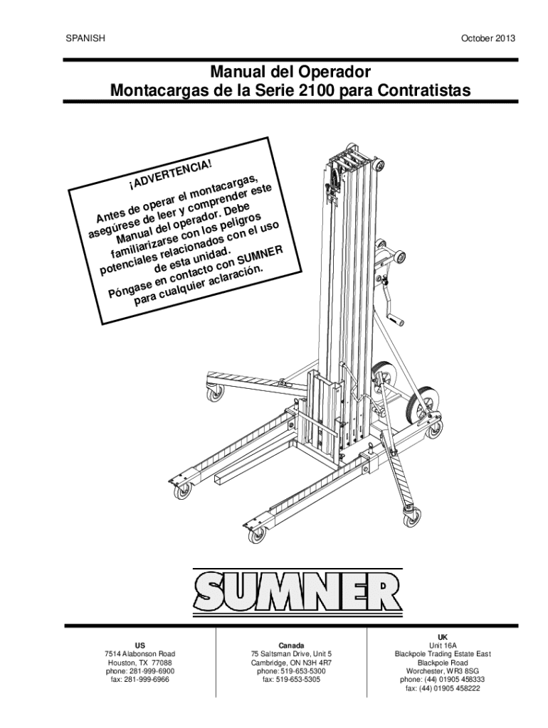 SPANISHOctober 2013Manual del Operador Montacargas de la Serie 2100 para ContratistasIA! ENC T R E as, ADV carg este a t n mo er ar el mprend e r e p o co . Deb s de er y Ante se de le perador eligros