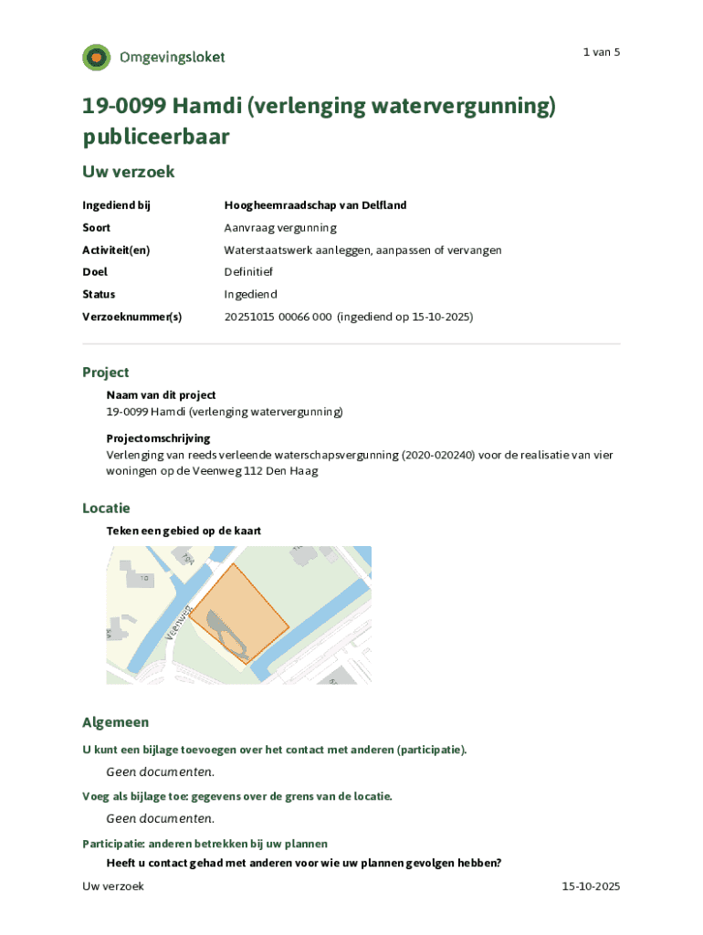 1 van 5190099 Hamdi (verlenging watervergunning) publiceerbaar Uw verzoek Ingediend bijHoogheemraadschap van DelflandSoortAanvraag vergunningActiviteit(en)Waterstaatswerk aanleggen, aanpassen of vervangenDoelDefinitiefStatusIngediendVerzoeknummer(s)20251015