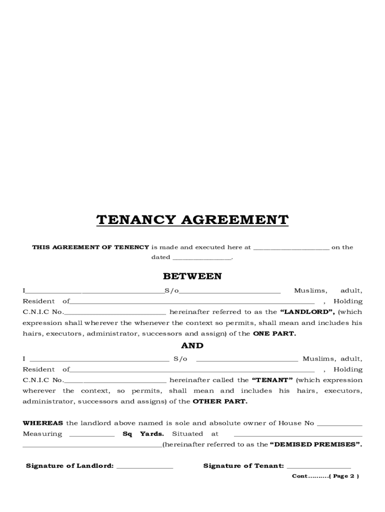 TENANCY AGREEMENT THIS AGREEMENT OF TENENCY is made and executed here at ___ on the dated ___.BETWEEN I___S/o___ ResidentMuslims,of___,adult, HoldingC.N.I.C No.___ hereinafter referred to as the LANDLORD,