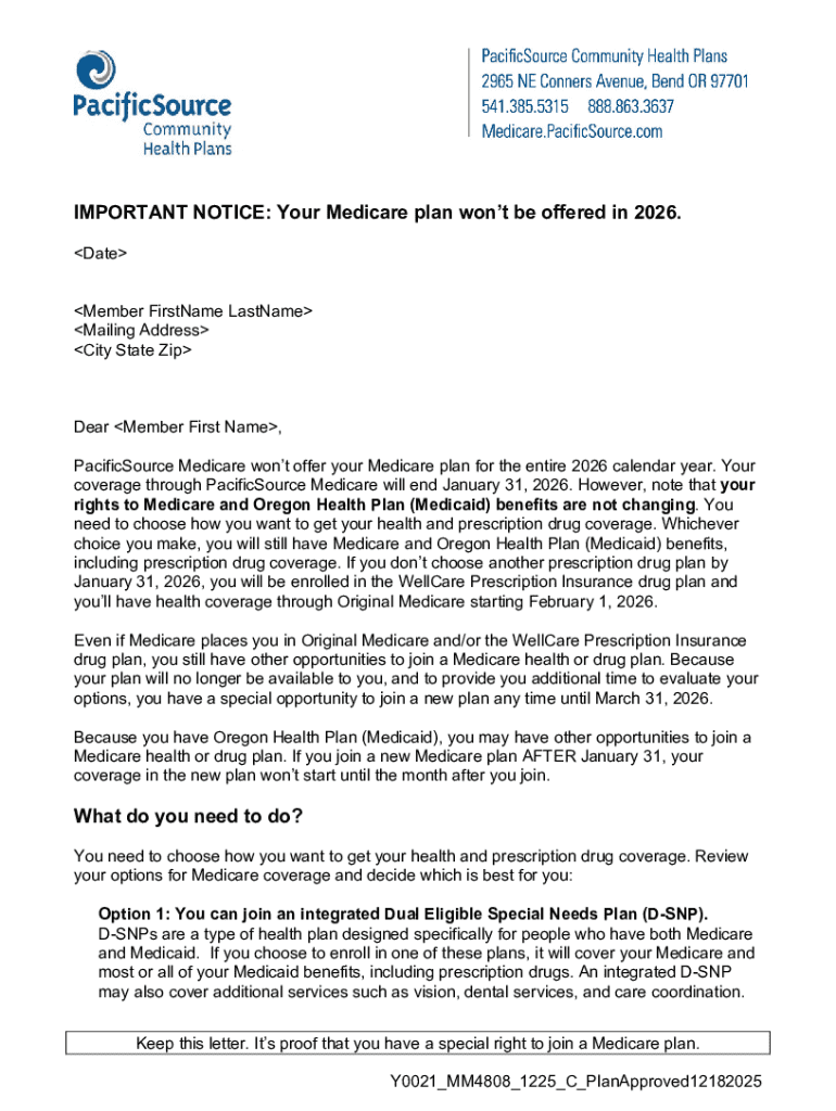 do not include title in notice set beneficiariesIMPORTANT NOTICE: Your Medicare plan wont be offered in 2026. Date Member FirstName LastName Mailing Address City State ZipDear Member First Name, PacificSource
