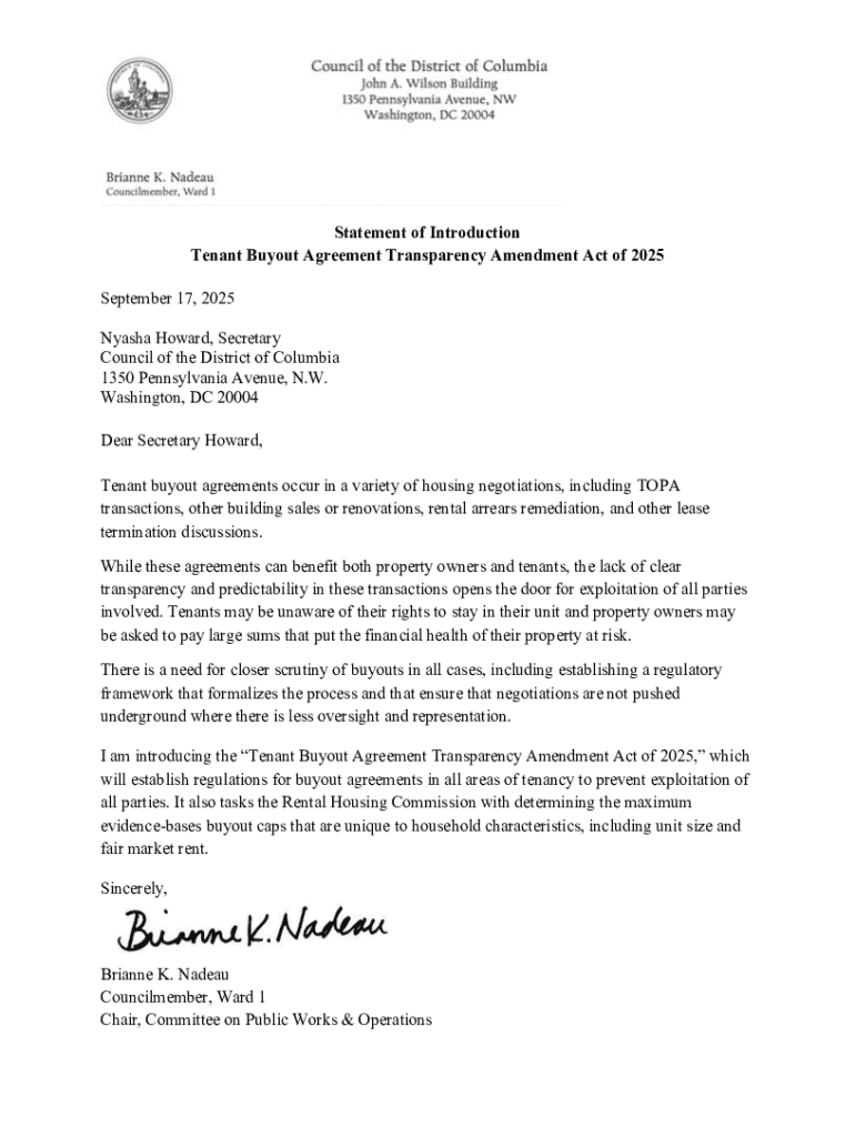 Statement of Introduction Tenant Buyout Agreement Transparency Amendment Act of 2025 September 17, 2025 Nyasha Howard, Secretary Council of the District of Columbia 1350 Pennsylvania Avenue, N.W.