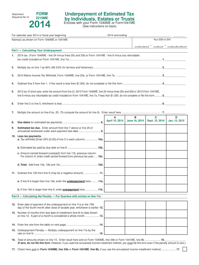Attachment Sequence No.15 FORM 2210ME 2014 Underpayment of Estimated Tax by Individuals, Estates or Trusts Enclose with your Form 1040ME or Form1041ME (See instructions on back) For calendar year