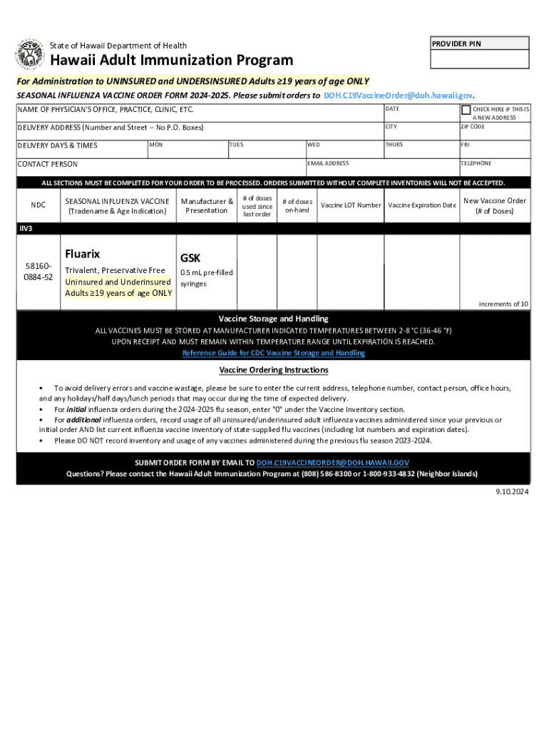 Get the free Influenza Vaccine Order Form - Hawaii Department of Health