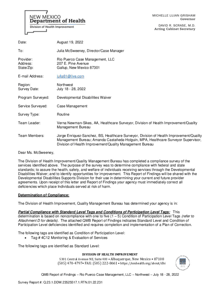 Date:August 19, 2022To:Julia McSweeney, Director/Case ManagerProvider: Address: State/Zip:Rio Puerco Case Management, LLC 207 E. Pine Avenue Gallup, New Mexico 87301Email Address:julia61@live.comRegion: