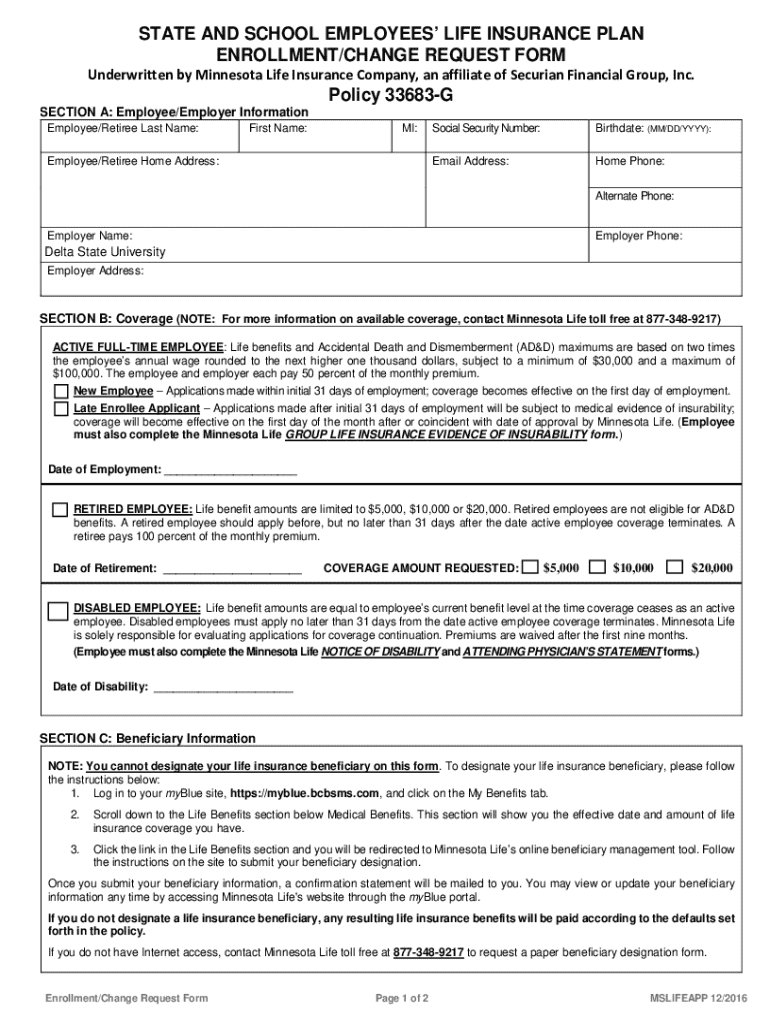 Get the free Life Insurance Plan Enrollment/Change Request Form