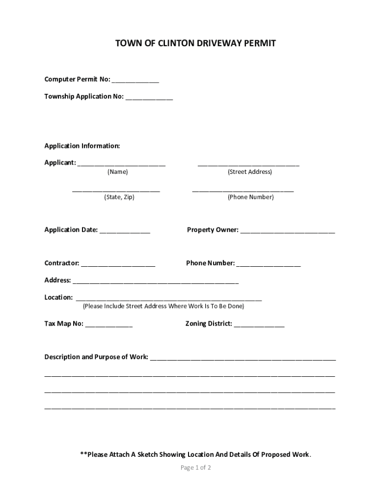 TOWN OF CLINTON DRIVEWAY PERMITComputer Permit No: ___ Township Application No: ___Application Information: Applicant: ___ (Name) ___ (State, Zip)___ (Street Address) ___ (Phone Number)Application