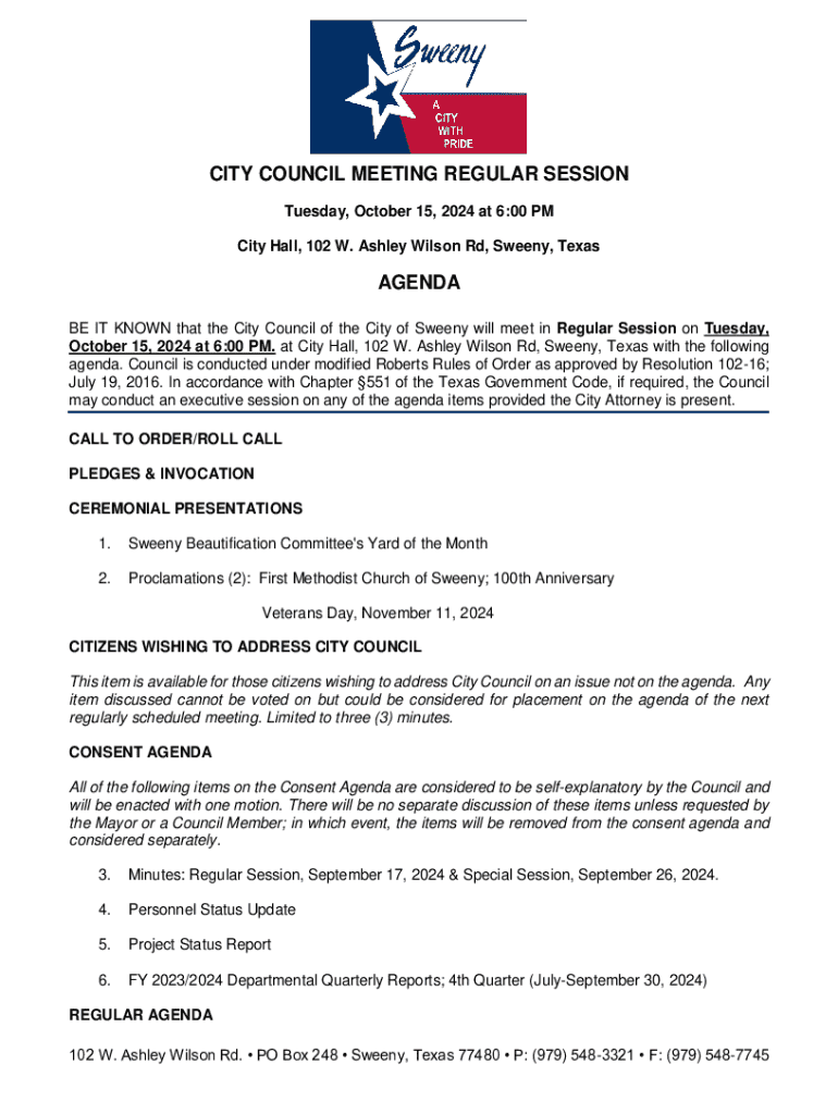 Get the free In accordance with Chapter 551 of the Texas Government Code, if required, the Council