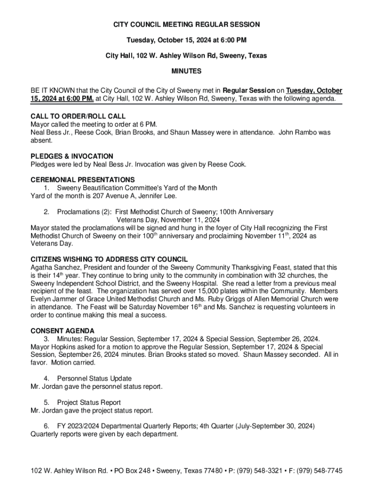 Get the free BE IT KNOWN that the City Council of the City of Sweeny met in Regular Session on Tu...