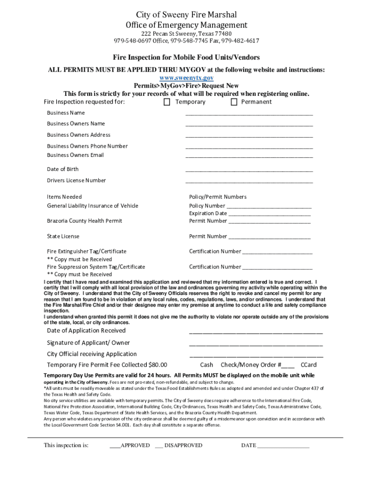 City of Sweeny Fire Marshal Office of Emergency Management222 Pecan St Sweeny, Texas 77480 9795480697 Office, 9795487745 Fax, 9794824617Fire Inspection for Mobile Food Units/Vendors ALL PERMITS MUST