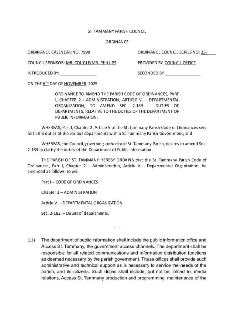 Used primarily within municipal or organizational frameworks, the ordinance calendar no 7998 form facilitates compliance with statutes and regulations. Its systematic layout allows for easy reference by stakeholders, making it an essential tool for legal professionals, government agencies, and community organizations alike.