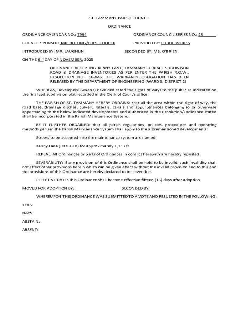 Get the free ORDINANCE ACCEPTING KENNY LANE, TAMMANY TERRACE SUBDIVISON
