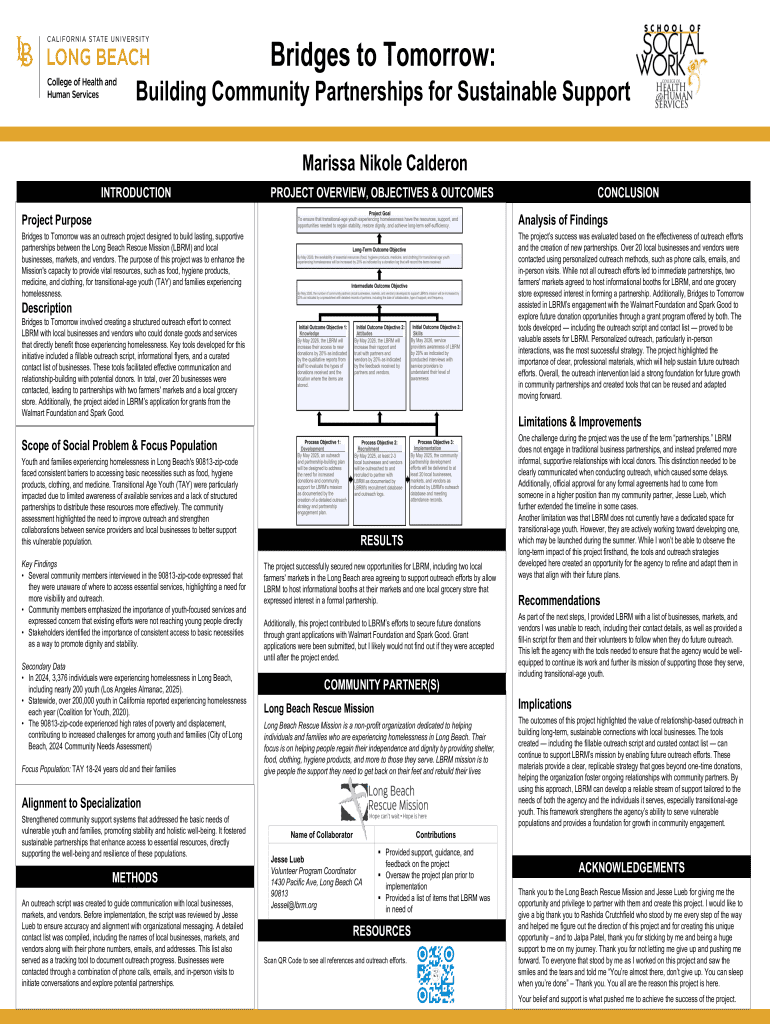 Bridges to Tomorrow: Building Community Partnerships for Sustainable Support Marissa Nikole Calderon INTRODUCTIONPROJECT OVERVIEW, OBJECTIVES & OUTCOMESCONCLUSIONProject PurposeAnalysis of FindingsBridges