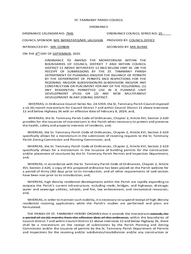 Completing the Ordinance Calendar No 7945 form starts with adequate preparation. Gather necessary documentation such as draft ordinances, reports, and public comments to ensure that you have all relevant information at hand. Reviewing previous ordinance calendars can provide valuable context and help in understanding the structure and common issues addressed in previous meetings.